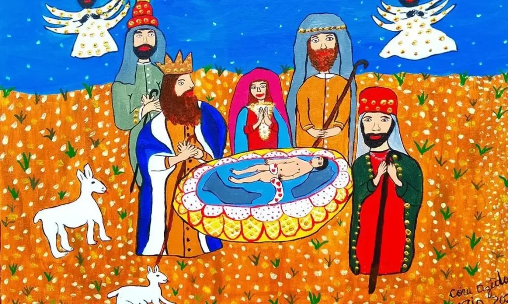 Nas artes visuais, o tema também inspira releituras contemporâneas. Em 2025, a artista carioca Cora Azedo apresentou um presépio em acrílico sobre tela, com cores vibrantes e anjos negros, fiel ao estilo naif que marca sua produção. A obra integrou uma exposição de presépios em João Pessoa (PB). “Esse é o segundo presépio que eu faço”, conta a artista, ao destacar a força simbólica e estética do tema.