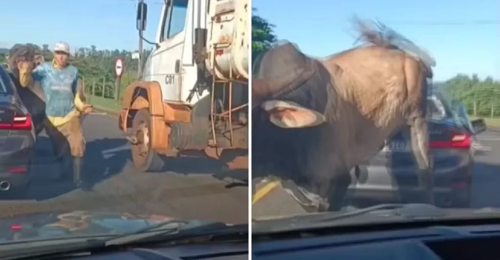 Imagens feitas por uma motorista mostram o momento em que o touro, inicialmente parado próximo a uma cerca, se agita e começa a correr atrás de um pedestre. O homem consegue escapar, mas o animal invade a pista e salta sobre o carro de luxo, destruindo o vidro traseiro e amassando parte da carroceria.