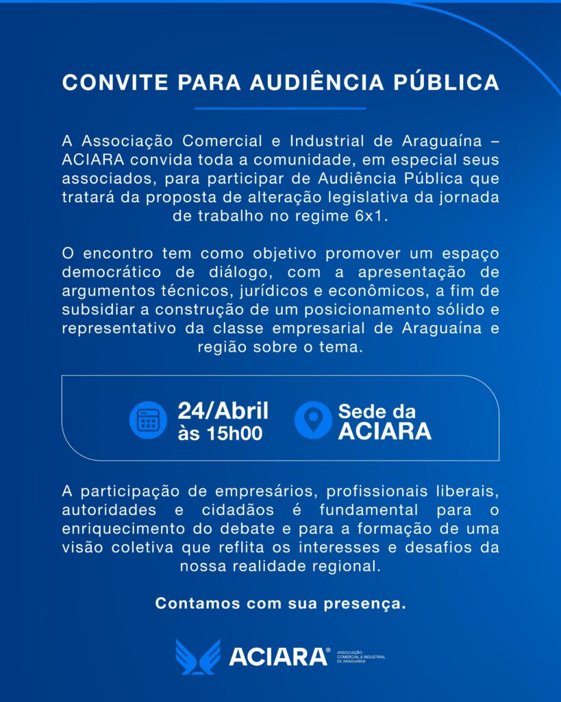 A possível mudança na jornada de trabalho 6×1, seis dias trabalhados para um de descanso, já acende alerta em Araguaína. Antes mesmo da decisão em Brasília, a Associação Comercial e Industrial de Araguaína (ACIARA) decidiu puxar o debate e convocou uma audiência pública para o dia 24 de abril, às 15h, na sede da entidade.
