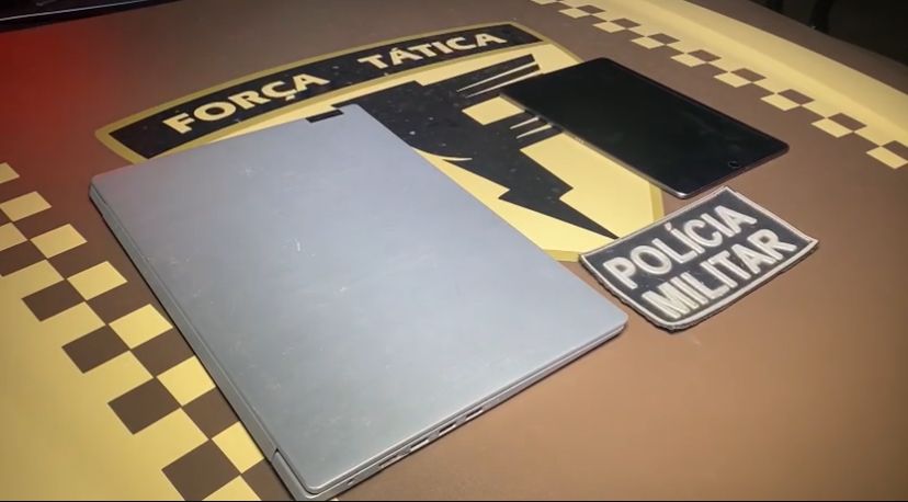 Por volta das 20h25, os policiais localizaram o suspeito na área externa coberta do estabelecimento. Durante a abordagem, foi solicitado que ele exibisse um saco preto que carregava. Ao verificar o conteúdo, os militares encontraram uma bolsa com um notebook prata da marca Lenovo e um iPad grafite.