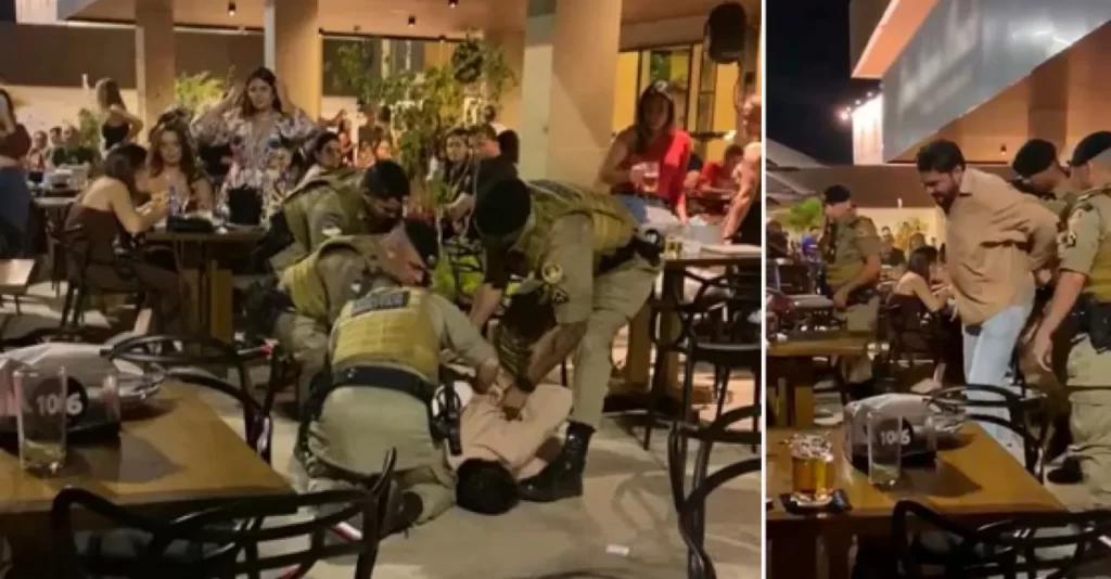Quatro militares precisaram usar força para contê-lo e levá-lo à Delegacia de Polícia Civil. O vídeo do momento, gravado por clientes, mostra a ação durante uma apresentação musical ao vivo. Ao fundo, é possível ouvir uma música de Tim Maia, e, após a prisão, o cantor que se apresentava ainda comentou no microfone: “Deixa a polícia trabalhar”.