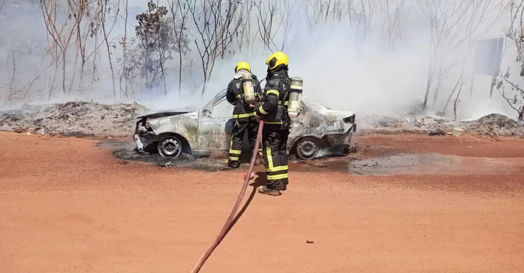 De acordo com os bombeiros, o automóvel Fiat Siena foi tomado pelas chamas e o fogo acabou se alastrando para a vegetação de cerrado próxima, aumentando os riscos de danos ambientais e de acidentes no trânsito.
