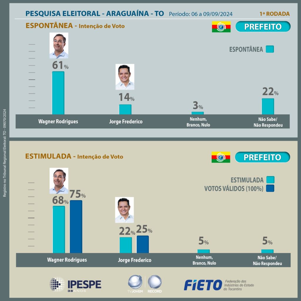 A pesquisa Ipespe/Fieto, divulgada pela TV Jovem Palmas/Record nesta quarta-feira (11), aponta o candidato Wagner Rodrigues (União Brasil) com 75% das intenções de votos do eleitor araguainense, o triplo do seu adversário Jorge Frederico (Republicanos), que aparece com 25% das intenções na pesquisa estimulada.