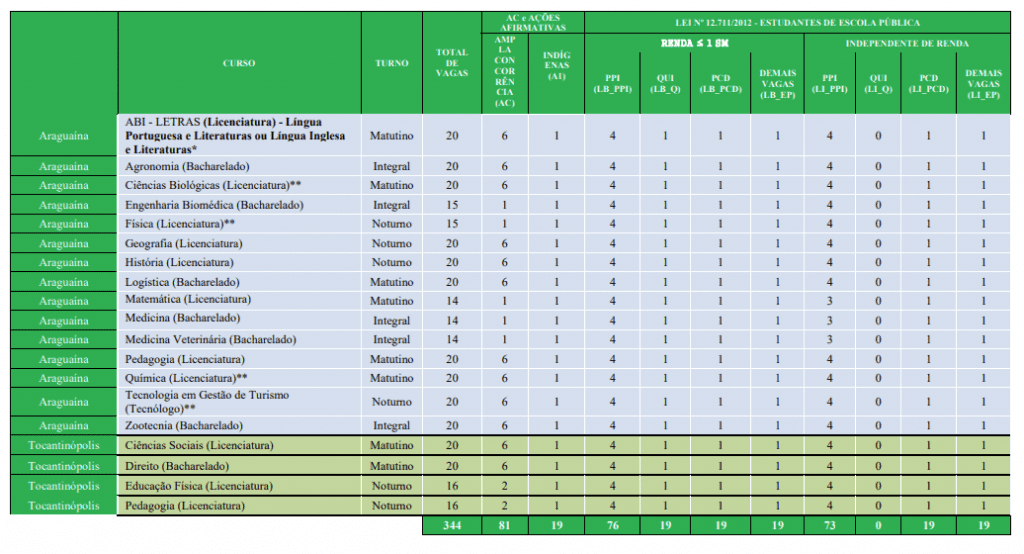 As vagas da UFNT estão divididas entre ampla concorrência, Lei de Cotas (Lei nº 12.711/2012) e ação afirmativa própria da universidade, que reserva 5% das vagas para estudantes indígenas.