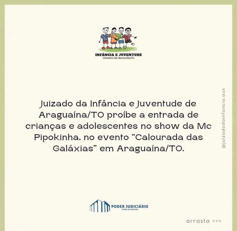 O Juizado da Infância e Juventude de Araguaína acatou um pedido da 9ª Promotoria do Ministério Público do Tocantins (MPTO) e proibiu a entrada de menores de 18 anos no show da MC Pipokinha. A apresentação está marcada para esta quinta-feira, 06, em uma calourada universitária em Araguaína.