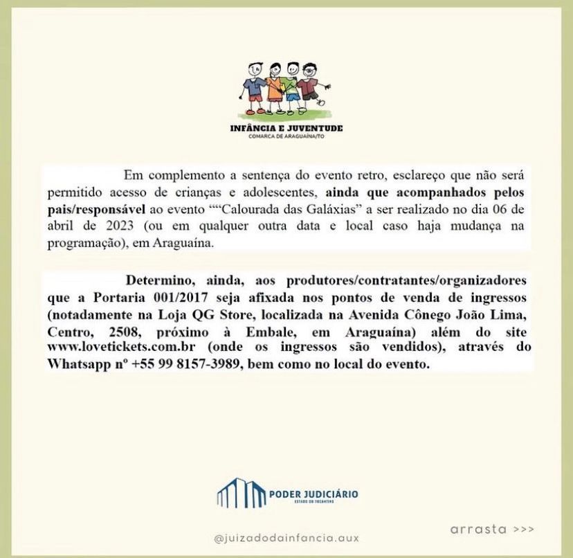 O juiz determinou ainda que a portaria 001/2017 seja afixada nos pontos de venda de ingressos e no site onde eles são vendidos, além do local do evento. Com essa decisão, o magistrado busca garantir o direito à informação, cultura, lazer, esportes, diversões, espetáculos e produtos e serviços que respeitem a condição peculiar de pessoa em desenvolvimento dos menores de idade.