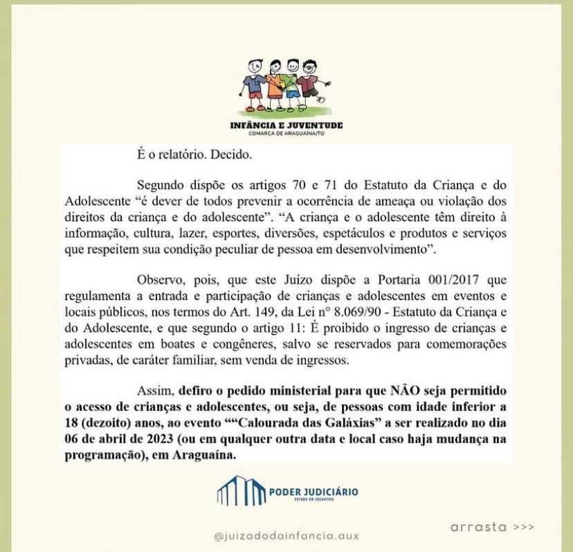 De acordo com a decisão, é proibido o ingresso de crianças e adolescentes em boates e locais semelhantes, salvo se reservados para comemorações privadas, de caráter familiar, sem venda de ingressos. Dessa forma, o acesso de pessoas com idade inferior a 18 anos no evento “Calourada das Galáxias” está vetado, mesmo que estejam acompanhadas pelos pais ou responsáveis.