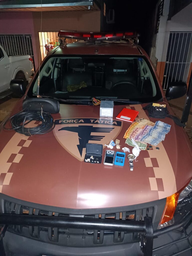 Foram apreendidos 24.1g de substância análoga à maconha; 36.1g de substância análoga ao crack; 2g de substância análoga à cocaína; 1 caixa de som JBL; 1 caixa de som Amvox ; 30 metros de fio/cabo PP; um caderno de anotações; uma balança de precisão; uma máquina de cartão; além de R$417,00 em espécie e $1 dólar.