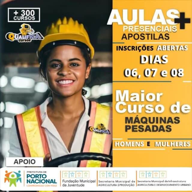 A prefeitura de Porto Nacional está dando total apoio ao curso de máquinas pesadas para homens e mulheres que acontecerá em Porto Nacional nesta terça e quarta-feira (07/03 e 08/03). As inscrições para o curso totalmente gratuito, estão acontecendo até esta quarta-feira, 08, no formato on-line e presencial na sede da Fundação Municipal da Juventude, localizada no setor Novo Planalto. Os candidatos, poderão escolher entre os cursos de Motoniveladora, Empilhadeira, Trator Agrícola, Pá Carregadeira, Retroescavadeira e Escavadeira Hidráulica.