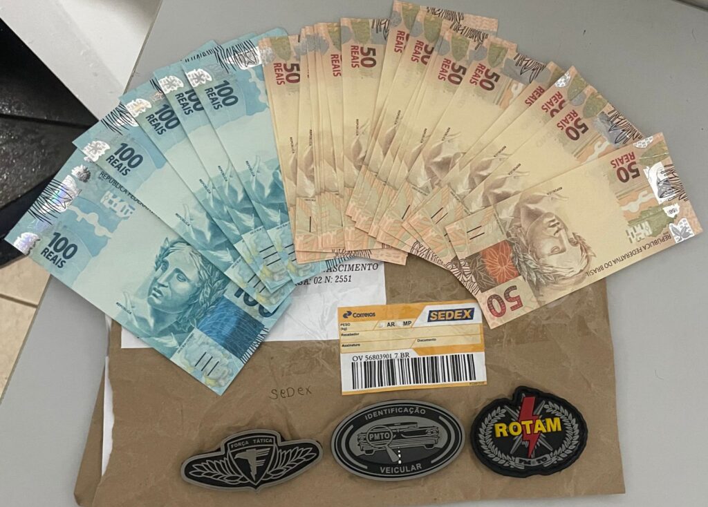 No local, os policiais localizaram o suspeito na saída da instituição. Ele estava portando um celular iphone 11, e um envelope, de cor marrom, com 27 réplicas de R$ 50,00 e cinco réplicas de R$ 100,00, totalizando R$1.850,00.