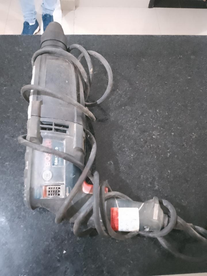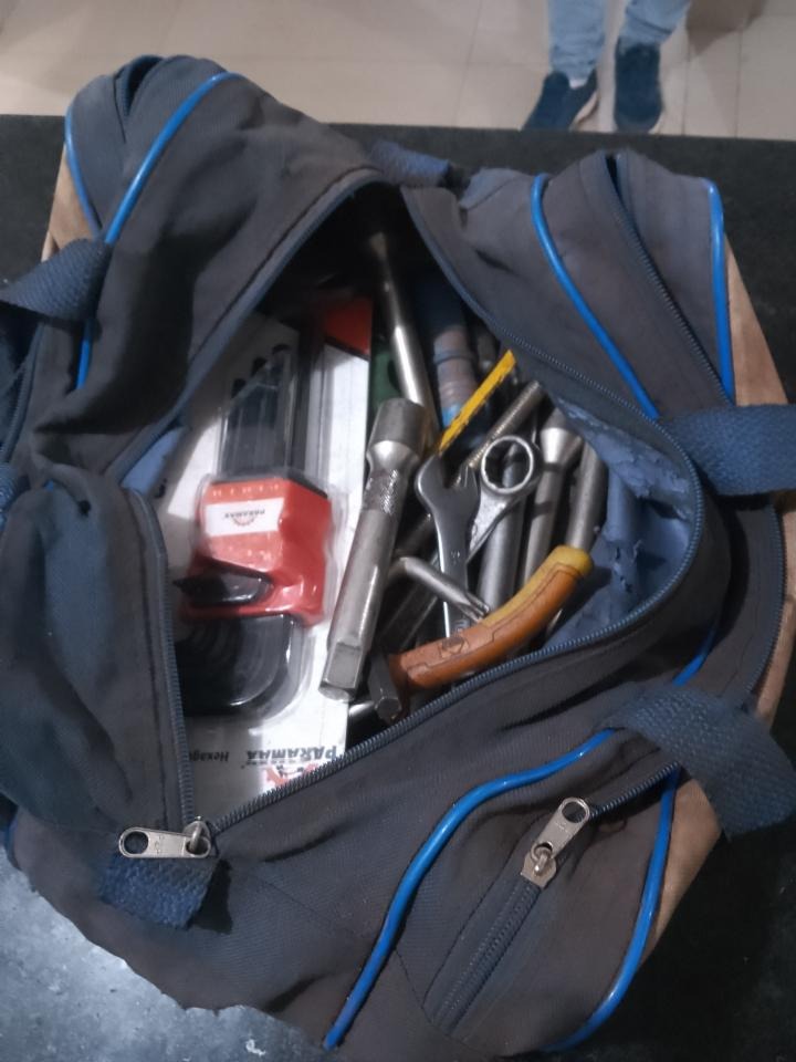 Ao realizar buscas pelas proximidades, os policiais encontraram o suspeito sentado próximo ao local, com as mesmas características repassadas na denúncia anônima. Com ele, foram localizadas a furadeira e a bolsa de ferramentas.