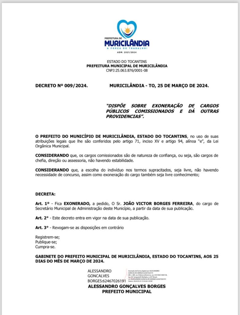 O documento, assinado eletronicamente pelo prefeito Alessandro Borges (Progressistas), comprova que João Victor deixou o cargo dentro do prazo estabelecido, seguindo todos os critérios legais. Apesar da oposição ter formalizado uma denúncia no Tribunal Superior Eleitoral (TSE), é esperado que a queixa seja descartada devido à evidência documental apresentada.