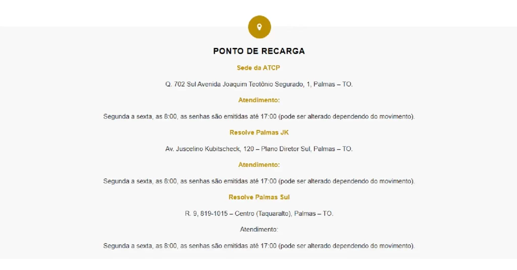 Para facilitar o acesso, o sistema conta com o aplicativo Sou Recarga, que permite solicitar cartões, acompanhar pedidos e fazer recargas online. Também é possível carregar créditos presencialmente na sede da ATCP, nas unidades do Resolve Palmas (JK e Taquaralto) e em pontos credenciados por toda a cidade, inclusive nos distritos. O pagamento pode ser feito em dinheiro, cartão ou Pix.