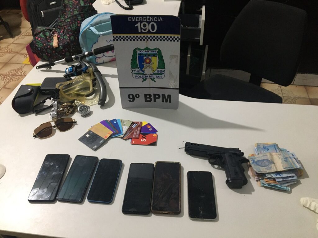 Os policiais militares recuperaram com o suspeito 9 (nove) aparelhos celulares; 18 cartões de crédito; um simulacro de arma de fogo, tipo pistola; e R$ 902 em espécie. Os itens recuperados foram levados à Central de Flagrantes e foi realizado o registro da ocorrência.