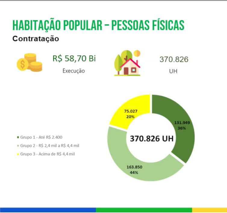 Considerando apenas o segmento habitacional popular, o resultado foi a produção de 370.826 unidades habitacionais, com uma execução de R$ 58,70 bilhões com destaque para a execução para as menores faixas de renda, do Grupo 1, rendimento de até R$ 2.400, e Grupo 2, rendimento de R$ 2.400 a R$ 4.400.