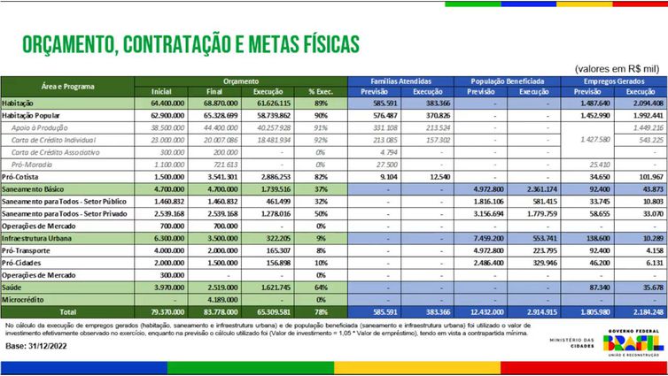 Na área habitacional, a execução chegou a 89%, totalizando um investimento de R$ 61,626 bilhões do orçamento total de R$ 68,870 bilhões, o que, segundo o Ministério das Cidades, fomentou a geração de 2.094.408 empregos e beneficiou a 383.366 famílias.