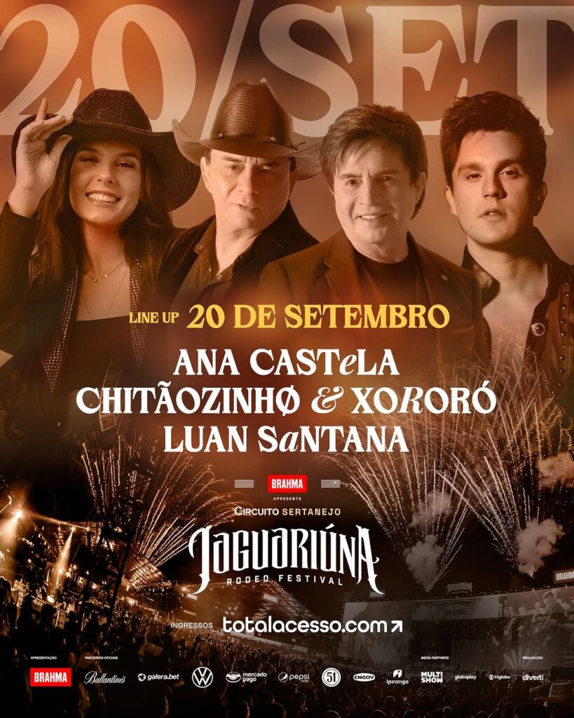 Além do Luan Santana, estão confirmadas a dupla Chitãozinho e Xororó e a cantora Ana Castela, ambos no dia 20 de setembro, e Lauana Prado, Zezé Di Camargo e Luciano e Gusttavo Lima no dia 21.