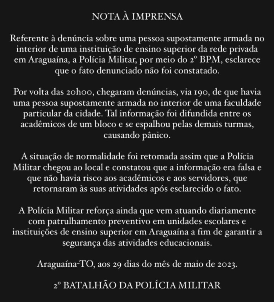 Os Patrulheiros da Guarda Municipal – GMA estiveram presentes no local para fornecer apoio aos policiais militares durante o atendimento da ocorrência. Após o registro do trote, a Polícia Militar do Tocantins, por meio da Assessoria de Comunicação do 2º BPM, emitiu uma nota para esclarecer o caso.