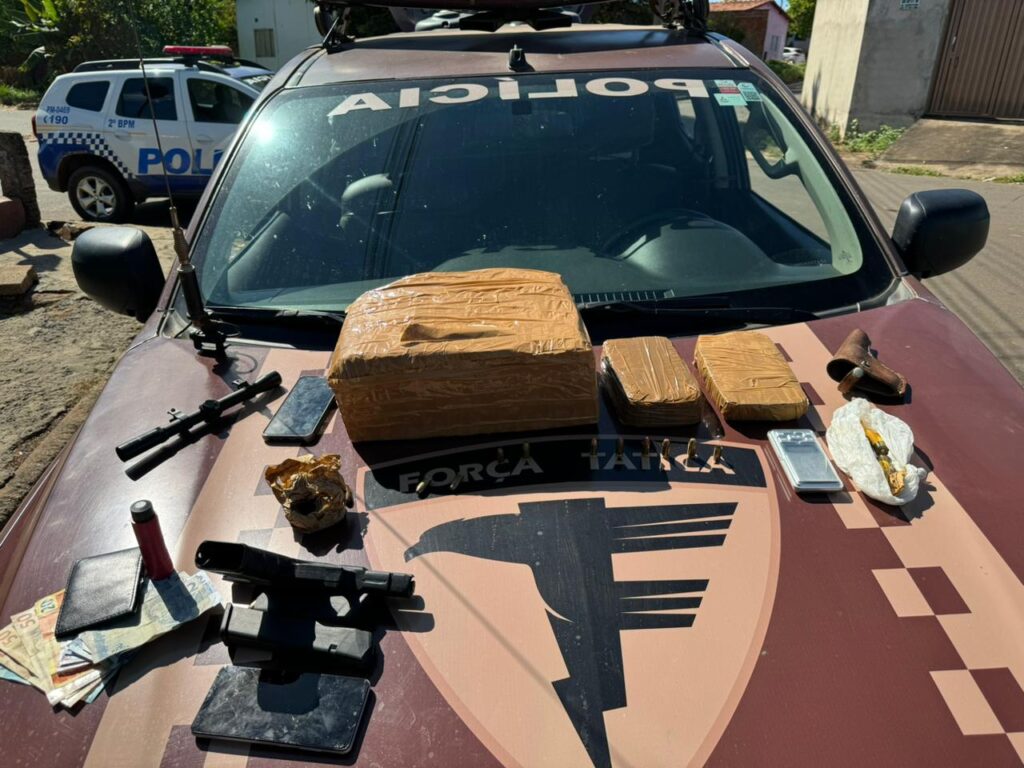Já na residência onde o suspeito tentou adentrar, havia dois homens, de 31 e 27 anos, que também tentaram fugir, mas foram abordados e identificados. No local, foram encontrados insumos para produção de munições de espingarda, 163 munições de chumbo, três cartuchos calibre 20, três munições deflagradas de calibre .38, uma munição de .380 intacta, e uma luneta de arma longa (rifle), além de porções de substância análoga à maconha.