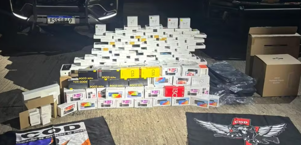 Foram apreendidos notebooks de diferentes marcas, uma grande quantidade de smartphones, caixas de som, cabos e adaptadores de força para aparelhos celulares de última geração; cases de notebook e carregadores portáteis.