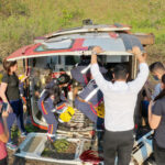 Mulheres são resgatadas após carro bater em caminhão, descer ribanceira e fica retorcido