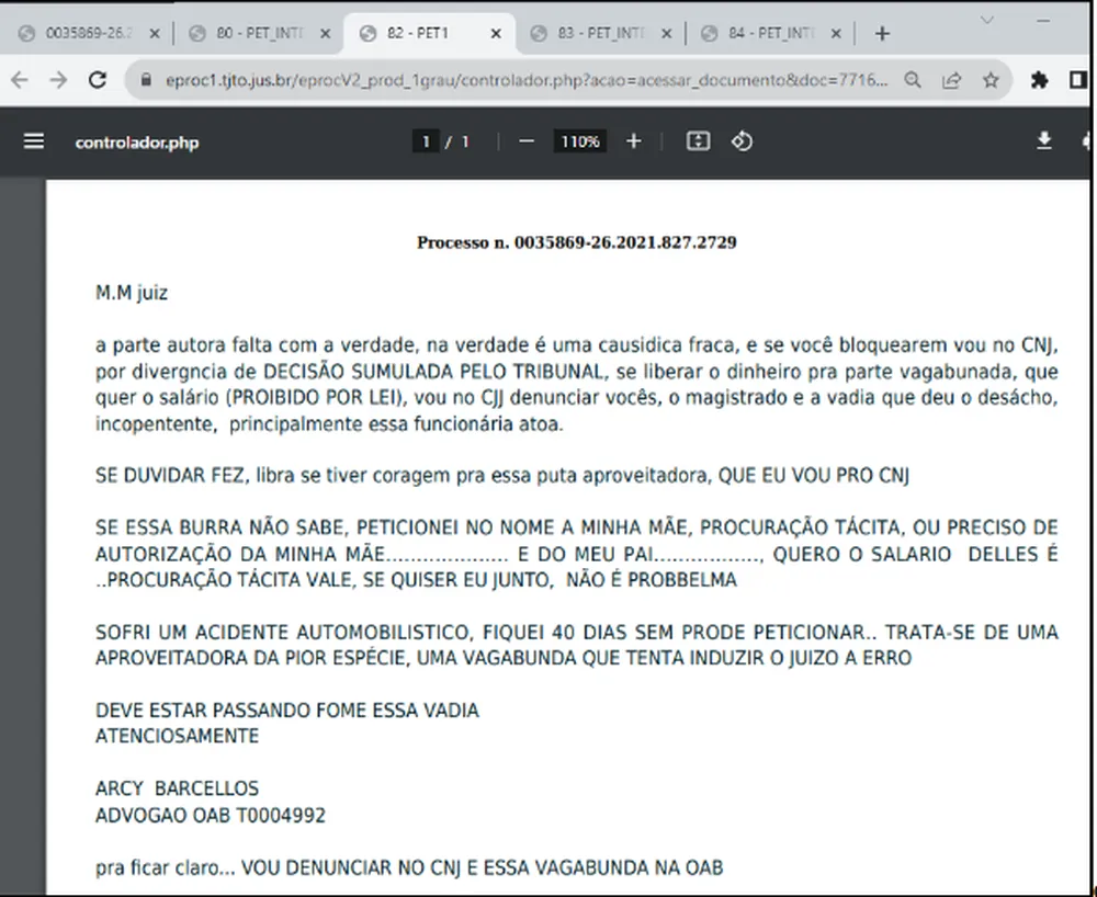 O advogado Arcy Barcellos será investigado pela OAB após xingar a autora de um processo, uma advogada e uma servidora do Tribunal de Justiça do Tocantins. Em um documento enviado ao juiz Jossaner Nery Nogueira, o profissional usa palavras ofensivas, como ‘vagabunda’, ‘vadia’ e ‘puta aproveitadora’.