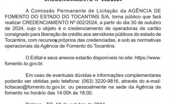 Em uma iniciativa que promete alavancar o mercado de crédito consignado no Tocantins, o Governo estadual – por meio da Agência de Fomento do Tocantins – publicou o edital de credenciamento nº 002 para administradoras e operadoras de cartões consignado em folha de pagamento, nas modalidades de crédito e benefício, cujas propostas serão recebidas a partir de 30/11/2024. O edital foi publicado no Diário Oficial do Estado do Tocantins nº 6682 de 22/10/2024.