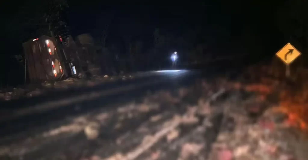Um acidente envolvendo um ônibus interestadual e uma carreta carregada com restos de gado foi registrado na noite de terça-feira (24), por volta das 21h15, na TO-134, entre os municípios de Angico e Darcinópolis, no norte do Tocantins. Segundo a Polícia Militar (PM), a carreta tombou e espalhou a carga de restos de animais na pista, criando uma situação de risco iminente.