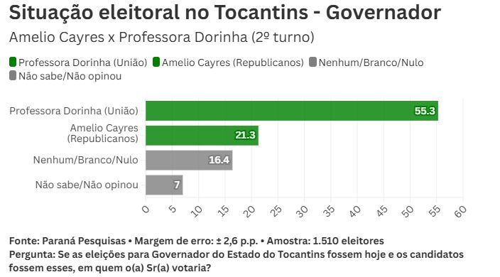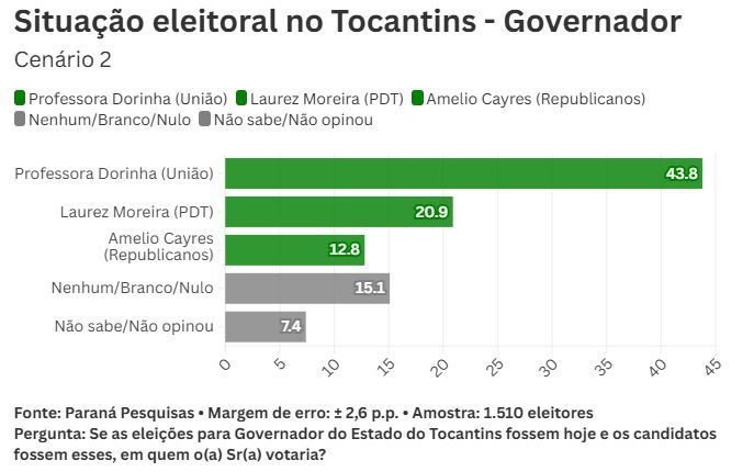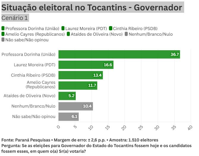 A senadora Professora Dorinha Seabra (União Brasil) é a favorita na corrida ao governo do Tocantins, segundo levantamento divulgado nesta segunda-feira (18) pelo instituto Paraná Pesquisas. O estudo aponta que, no primeiro cenário avaliado, a parlamentar tem 36,7% das intenções de voto, mais que o dobro do índice do vice-governador Laurez Moreira (PDT), que soma 16,6%.