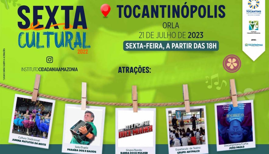 A Secretaria da Cultura (Secult), em parceria com o Instituto Cidadania Amazônia, realiza nesta sexta-feira, 21, no município de Tocantinópolis, extremo norte do Tocantins, mais uma edição do projeto Sexta Cultural. O evento ocorrerá na orla da cidade e contará com cinco atrações artísticas, que se apresentarão gratuitamente para a população.
