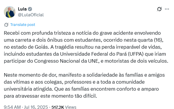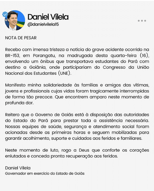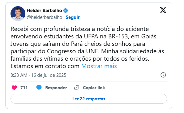 “Receba com profunda tristeza a notícia do acidente entre estudantes da UFPA na BR-153, em Goiás. Jovens que vieram do Pará cheios de sonhos para participar do Congresso da UNE. Minha solidariedade às famílias das vítimas e orações por todos os feridos”, disse Helder Barbalho em uma rede social.
