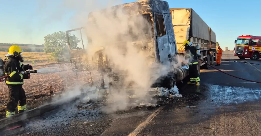 A equipe de socorro foi acionada e, ao chegar ao local, confirmou que o fogo estava concentrado na cabine (cavalinho) da carreta. Para garantir a segurança, os bombeiros isolaram a área e bloquearam totalmente o tráfego na rodovia.