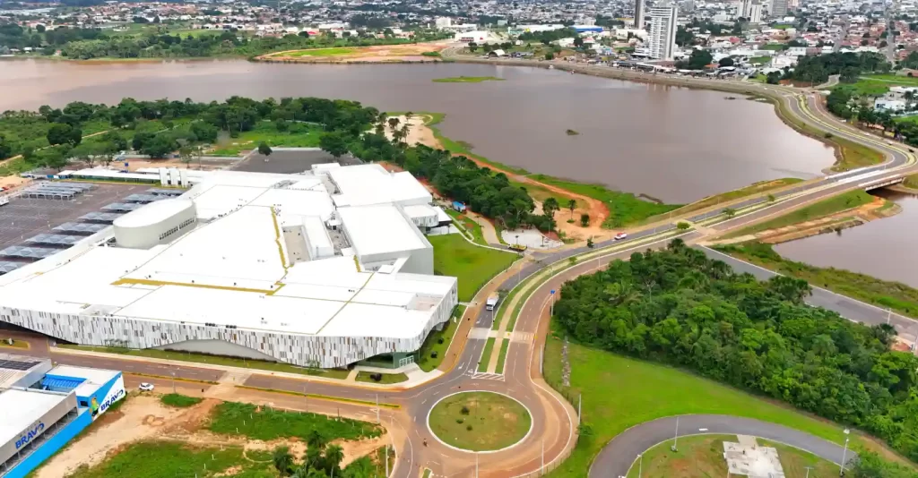 O acesso principal para veículos será pelo Bosque do Lago Center Shopping, ao lado da Prainha. O trajeto direciona os motoristas a um estacionamento secundário antes da cancela, atravessando o pátio em linha reta, com pequeno trecho de estrada de terra e entrada lateral para o estacionamento principal.